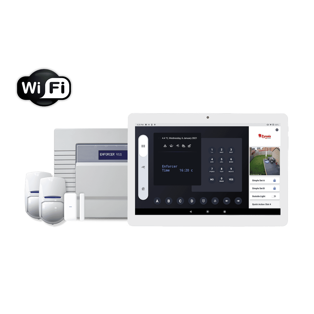 The kit includes a wireless magnetic door contact and 2 x pet immune wireless motion sensors that use secure blue wave wireless technology and have a long 2-year battery life. Also included is a master control panel with an integrated Wi-Fi communication module and the Pyronix home control hub Android tablet.