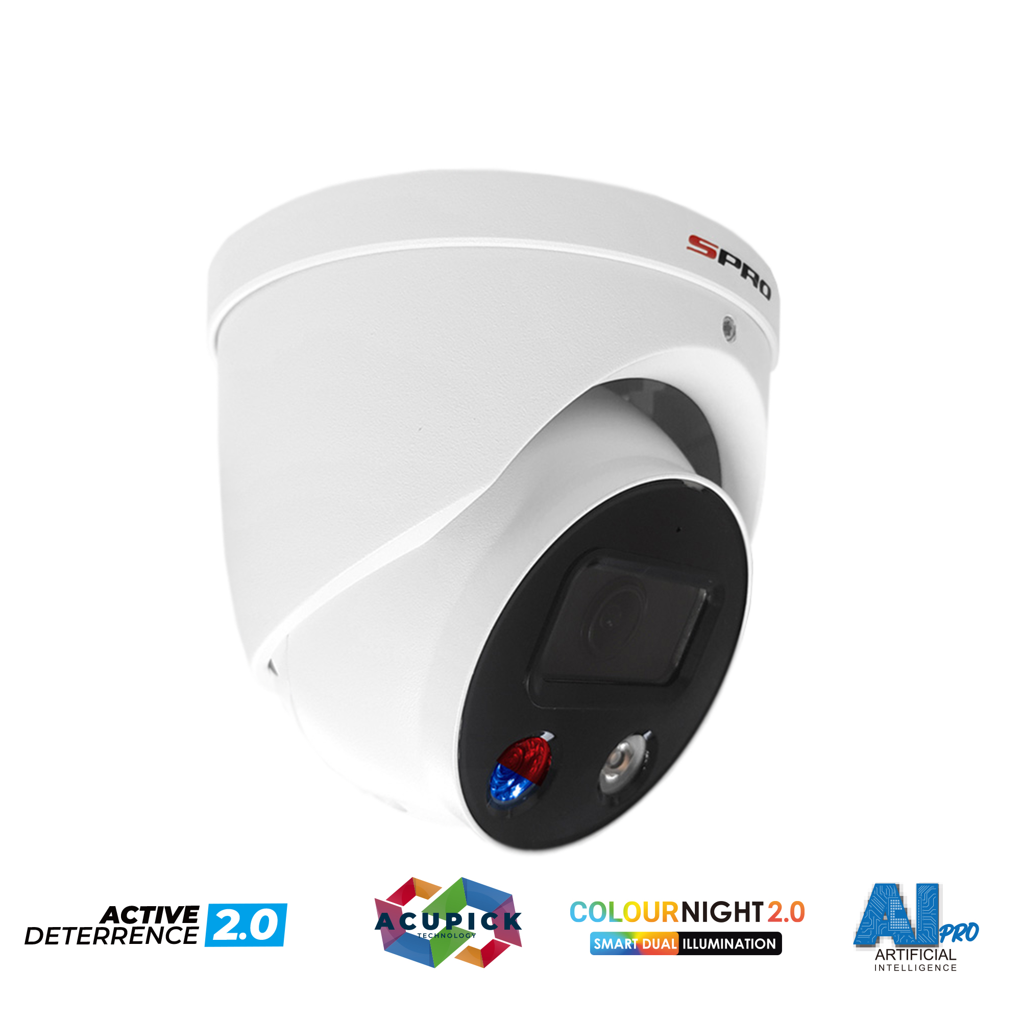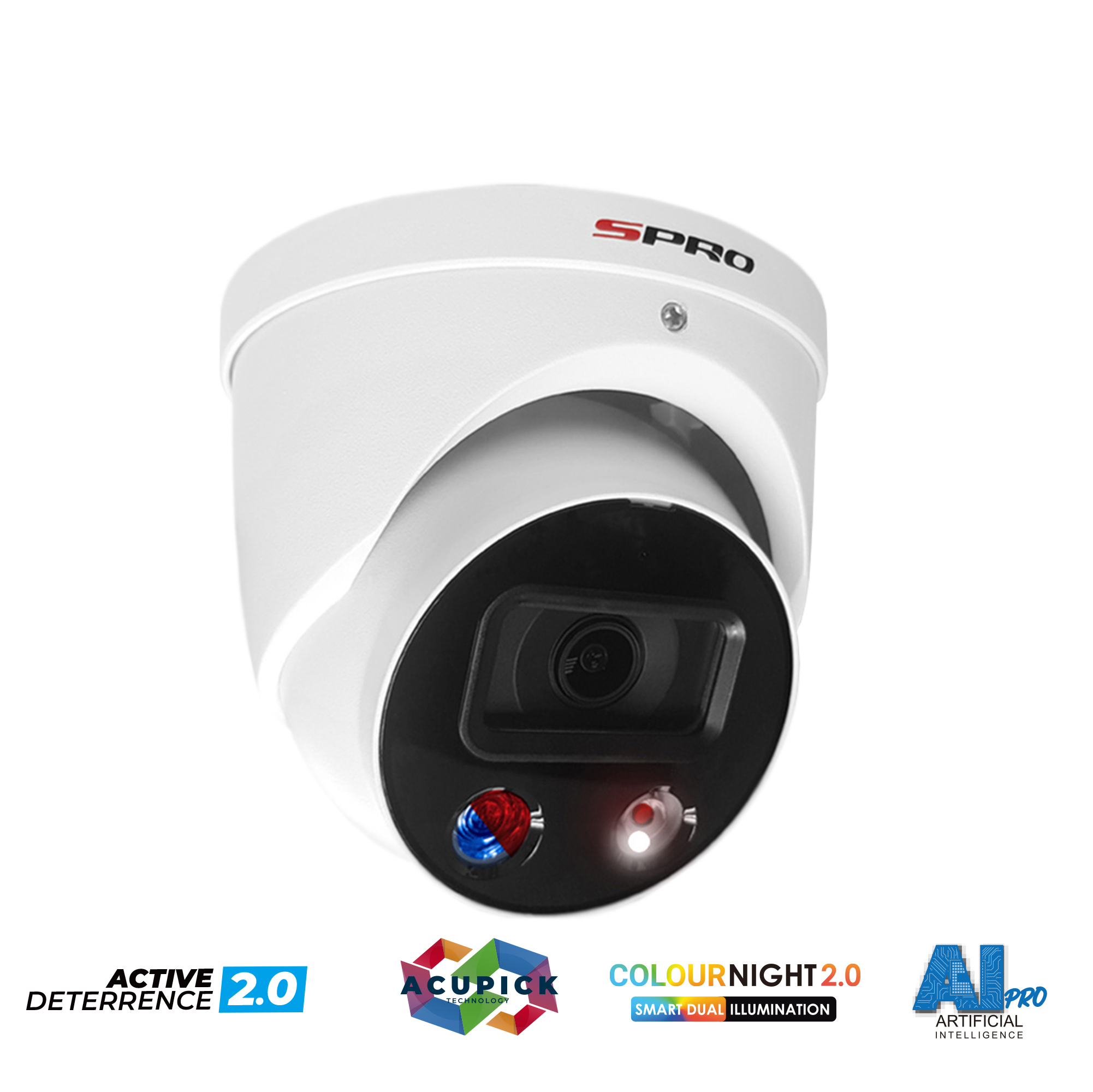 Introducing the SPRO Smart Dual Illumination Active Deterrence camera series, meticulously crafted to proactively deter crime. These cutting-edge cameras boast red and blue flashing lights, a two-way audio system with a built-in speaker, and pre-recorded messages to enhance security measures.